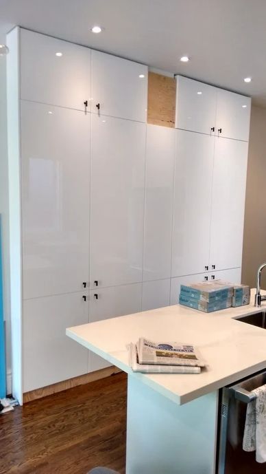 It was a combination of IKEA RINGHULT glossy white style doors & custom made doors . In order to camouflage the odd wall we had to create falls doors paneling next to the customized pantry. We assembled the falls doors to the 63 x 110 " plywood sheet ( huge and heavy ! ) and attach it to both wall behind and the pantry on the right.